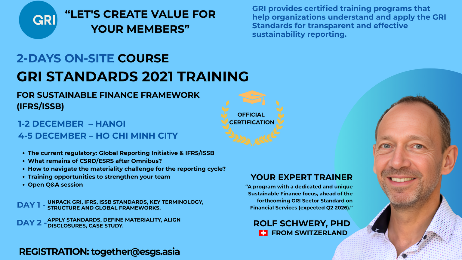 ESGs & Climate Consulting, the exclusive GRI Training Partner in Vietnam and Thailand, is joining forces with Acting Responsibly (Switzerland), an officially licensed GRI Training Partner, to deliver a two-day professional GRI Certified Training in Hanoi and Ho Chi Minh City.