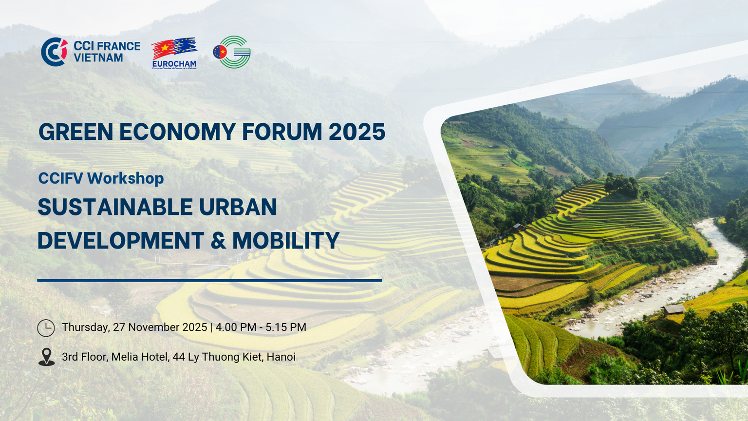 The French Chamber of Commerce and Industry in Vietnam (CCIFV) is delighted to host a workshop on Sustainable Urban Development & Mobility during the Green Economy Forum 2025 — a flagship event dedicated to advancing Vietnam’s green transformation. On November 27, 2025, let’s reimagine urban growth by designing for people, purpose, and lasting impact.