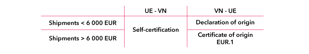 For shipments exported from Vietnam to the European Union (VN → EU), the value of the shipment is to be taken into consideration. As Vietnam has not exercised the option to use self-certification in any circumstances, Vietnamese exporters must obtain a certificate of origin in the form "EUR.1" for shipments with a value exceeding EUR 6,000. Below this amount, they can certify the origin of their products through a declaration of origin.