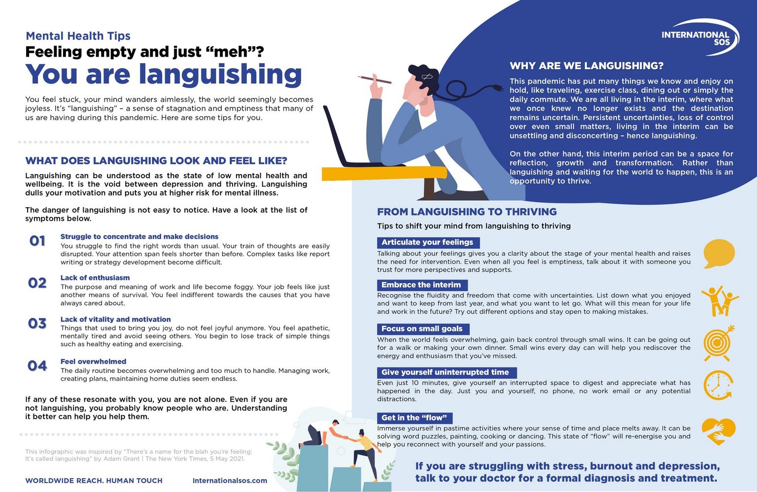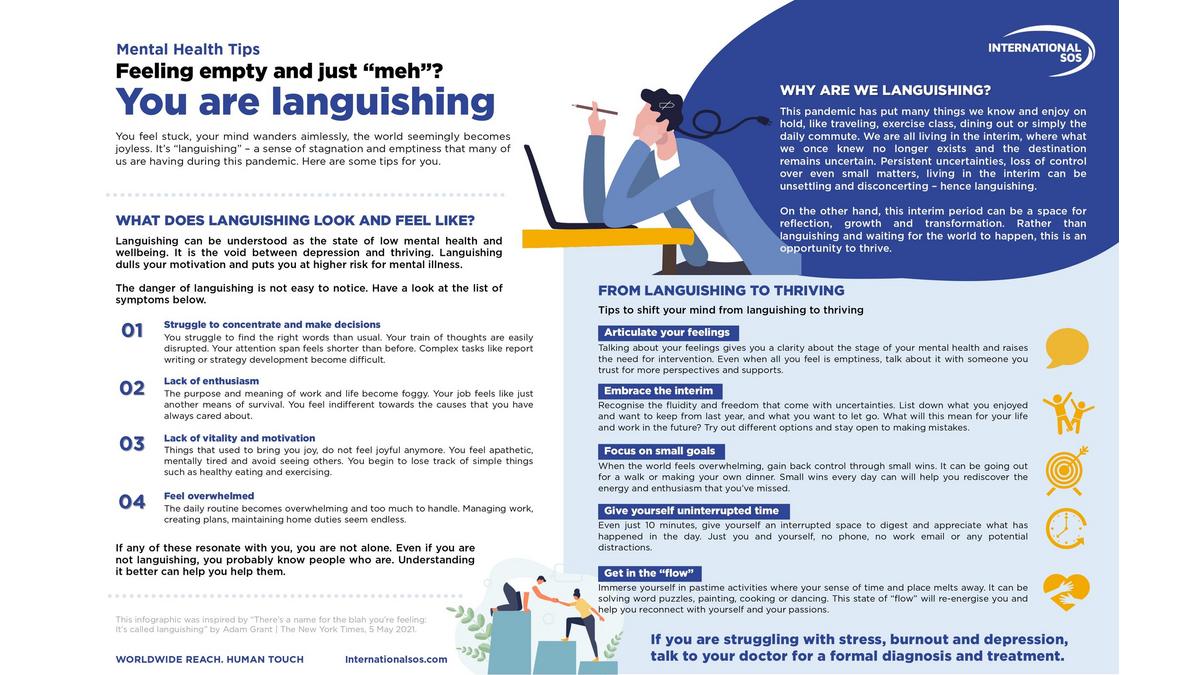 Languishing dulls your motivation and puts you at higher risk for mental illness. Here are some mental health tips from International SOS for you. Interested to test your mental health and wellbeing knowledge, click here to participate in this short assessment.