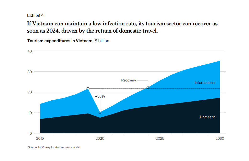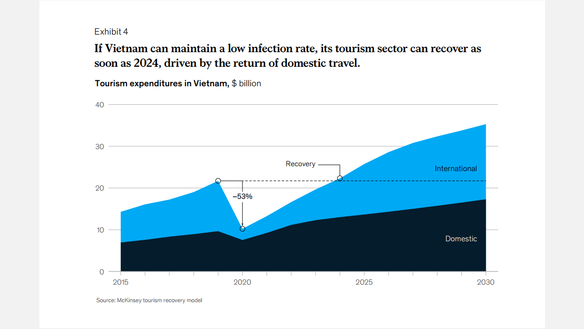 By implementing the zero-case-first approach and taking into account Vietnam’s currently resilient local economy and proactive government campaigns, Vietnam’s tourism sector could recover to precrisis levels in 2024 (Exhibit 4).