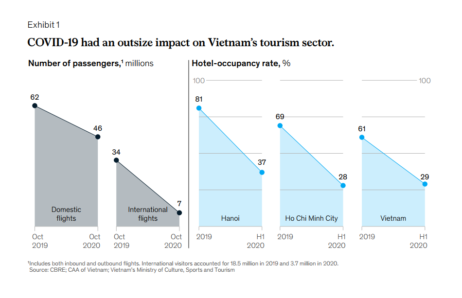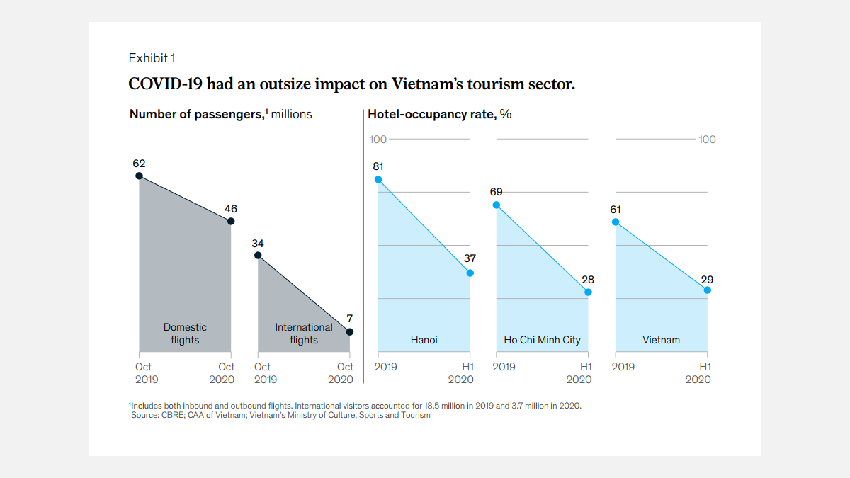Vietnam’s tourism sector relies heavily on international travel, which plunged last year. International flights dropped 80 percent in October 2020 from the same time period a year earlier (Exhibit 1). Hotels, in turn, filled only 30 percent of their rooms.