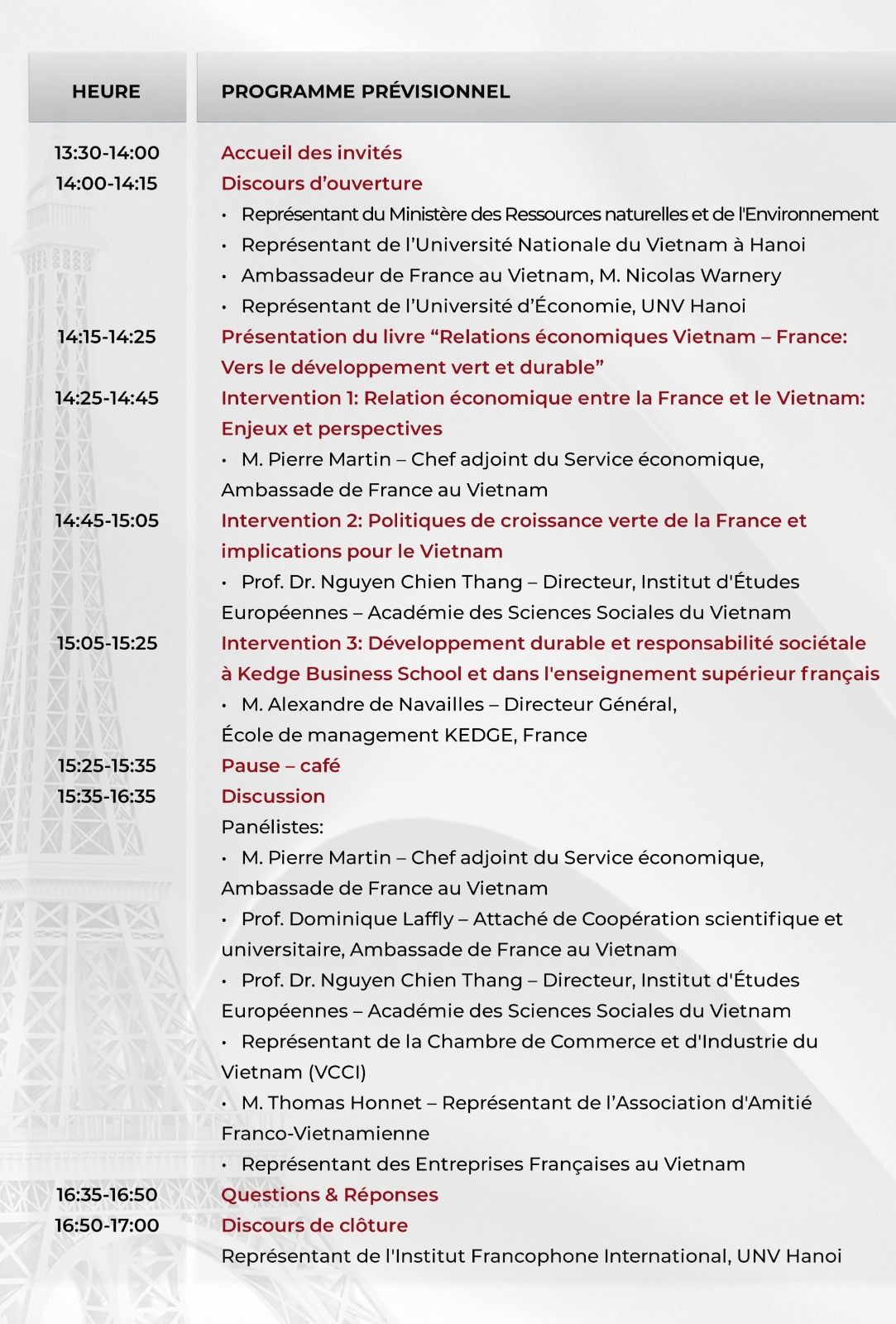 En présence de M. Nicolas Warnery, Ambassadeur de France au Vietnam, vous pourrez assister à une table ronde présidée par deux modérateurs : Prof. TO The Nguyen, Vice-Doyen de la Faculté des Sciences Économiques et Politiques, Université d'Économie - Université Nationale du Vietnam à Hanoi et Dr. DAO Tung, Enseignant-chercheur à l’Institut Francophone International - Université Nationale du Vietnam à Hanoi.