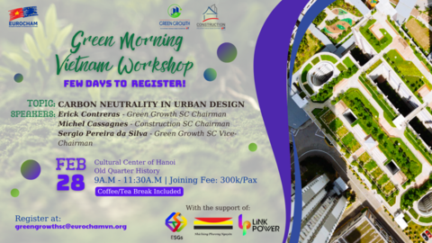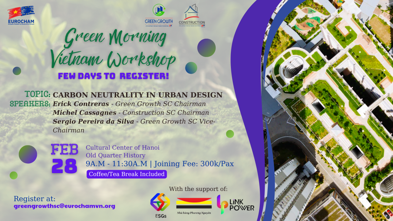 On February 28, the Green Growth Sector Committee - EuroCham Vietnam invites you to our Green Drinks Series, especially with this new format 2024, the Green Morning Vietnam Workshop in Hanoi. This edition, will be a roundtable discussion on the topic of Carbon Neutrality in Urban Design with introduction background from GGSC Sustainable Cities & Buildings Working Group as well as the Construction sector committee, promises to be interesting.
