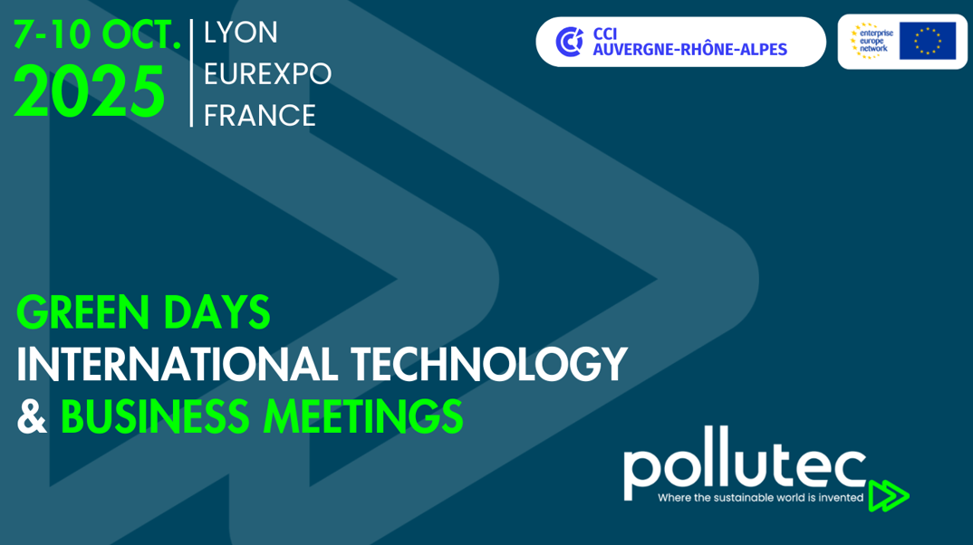 Dans le cadre du salon Pollutec, rendez-vous incontournable des secteurs de l’environnement et de l’énergie, le réseau Enterprise Europe Network organise les rencontres d’affaires internationales GREEN DAYS du 7 au 10 octobre 2025 à Lyon (Hall 4 – K0410).