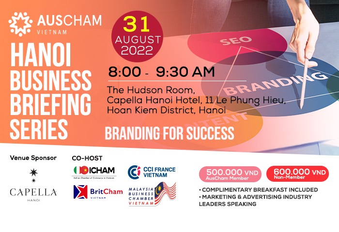 You are cordially welcomed to the Hanoi August Business Briefing Series – Branding for Success, which is being co-hosted by AusCham and other Business Associations inducing CCIFV.