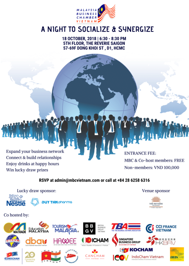 We are pleased to announce that MBC Vietnam will be organizing the MBC Business Networking Evening on 18th October 2018. This event bring together members and non-members from different international chambers in Vietnam and create a business networking platform to connect and build relationships while having drinks at happy hours. This event also aims to connect and create a business networking opportunity for different business sectors and trade commissions from various countries in Vietnam.