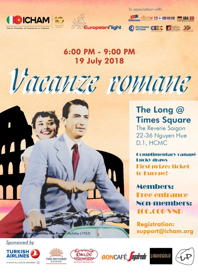 We are pleased to inform you that the next edition of European Night will be hosted by ICHAM with the theme "ROMAN HOLIDAY" at one of the best restaurants/ bars in town: The Long @ Times Square (The Reverie Saigon).