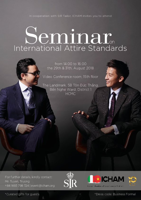 Understanding the importance of Business Professional Attire, we are pleased to present to you the Seminar hosted by the Italian Chamber of Commerce in Vietnam (ICHAM), in collaboration with SIR Tailor "International Attire Standards" with details as follows:
