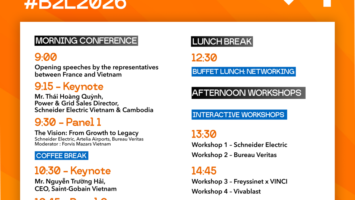 Build to Last 2026 s’inscrit au cœur de cette transformation. Plus qu’une conférence sur la construction, l’événement propose une vision globale du développement urbain durable, en croisant urbanisme, infrastructures, énergie, matériaux, mobilité et logistique. Il offre une plateforme de dialogue unique entre acteurs publics et privés, experts internationaux et leaders locaux, pour construire ensemble les villes vietnamiennes de demain.