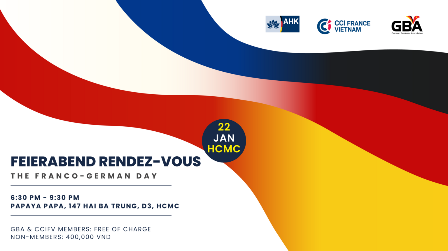 AHK, la CCIFV et la German Business Association (GBA) ont le plaisir de vous inviter à célébrer la Journée Franco-Allemande le 22 janvier 2025 à partir de 18h30.