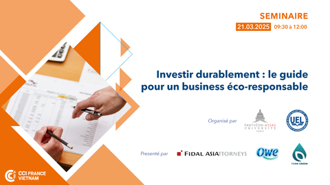 La Chambre de Commerce et d’Industrie Française au Vietnam (CCIFV) a le plaisir de soutenir le séminaire "Réussir l’investissement durable", organisé par Assas et UEL, un événement incontournable pour les entrepreneurs et investisseurs souhaitant intégrer les enjeux environnementaux dans leurs stratégies de développement.