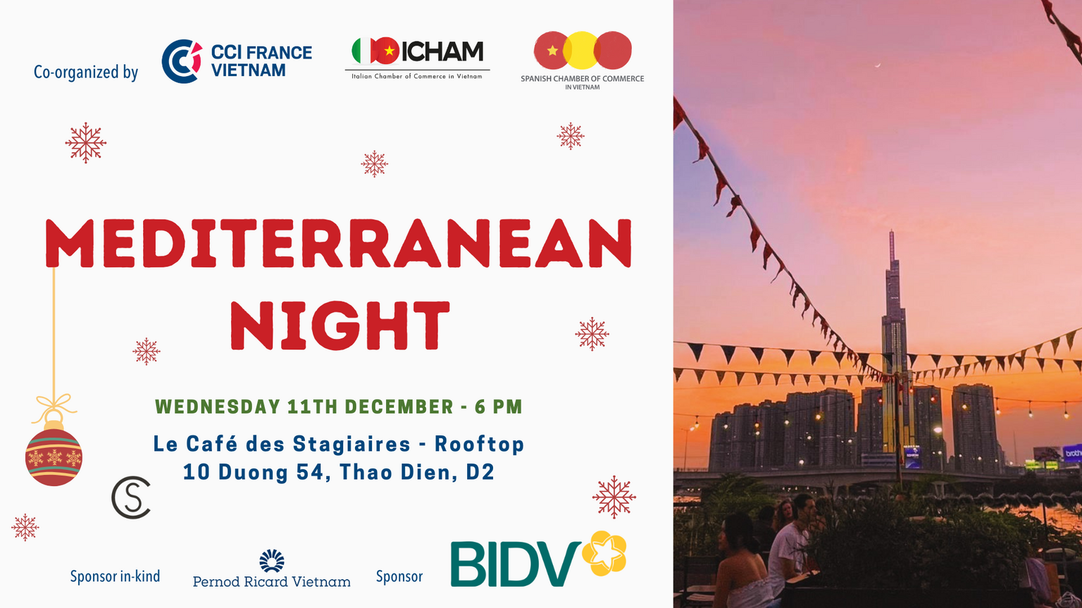 Tarif : Entrée : 350 000 VND (un apéritif dînatoire et 2 boissons compris).