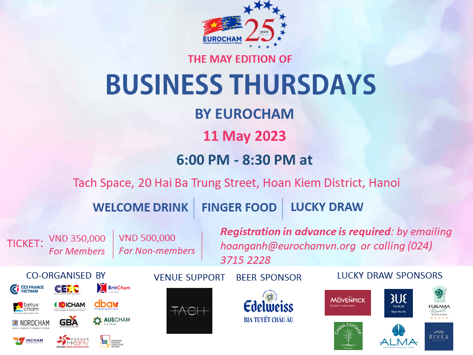 And the best part? EuroCham Chairman Gabor Fluit and Executive Director Delphine ROUSSELET will fly from HCMC to attend and meet our members. Be there to make this event truly special. Don't miss out on the chance to network, make new connections, and win exciting prizes!