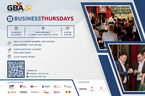 L'Association des Entreprises Allemandes - GBA a le plaisir d'organiser l'édition d'août des « Business Thursdays », une série événementielle phare de networking de haut niveau organisée mensuellement par les principales associations commerciales étrangères au Vietnam.