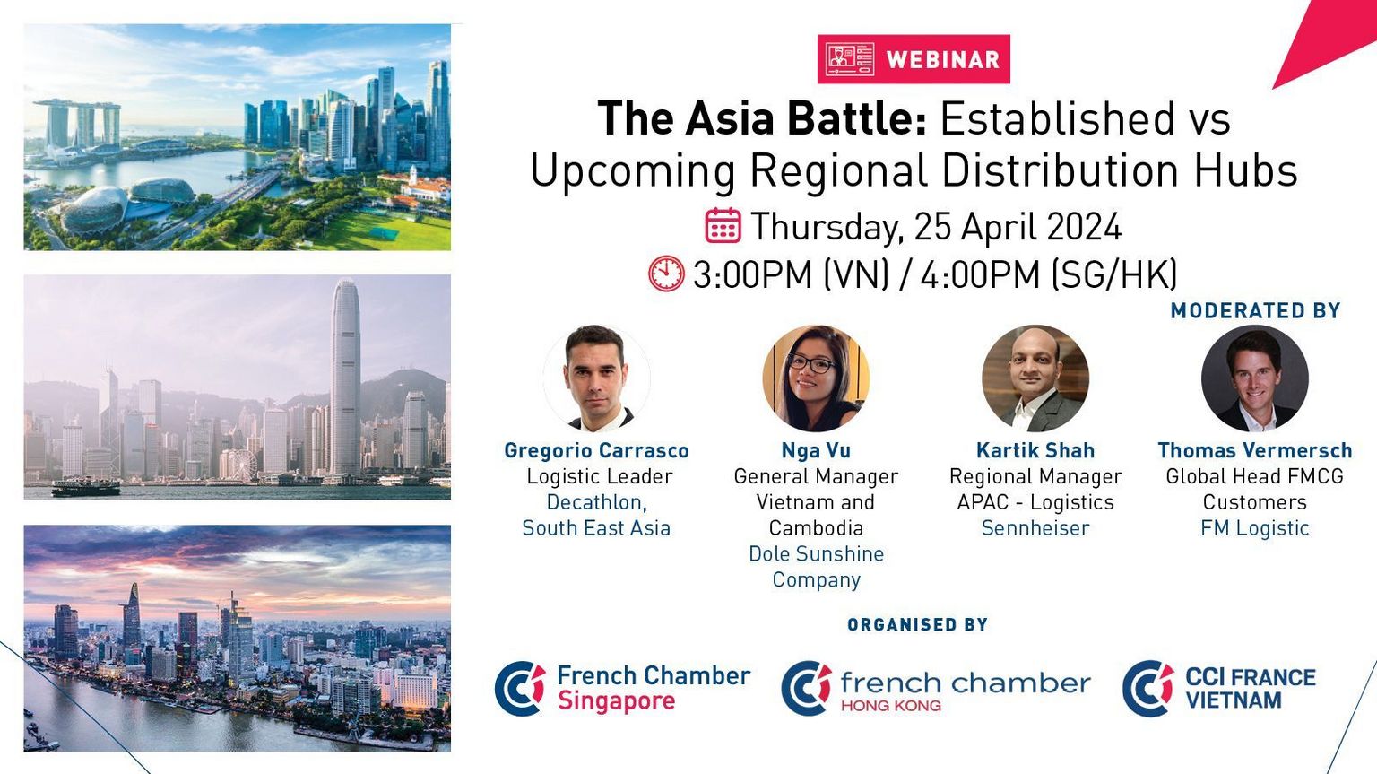 Les Chambres de Commerce Françaises de Singapour, de Hong Kong et du Vietnam ont le plaisir de vous inviter à un webinaire sur "La Bataille Asiatique : Hubs de Distribution Régionaux Établis  vs les nouveaux acteurs prometteurs " le 25 avril à 15 heure pour le Vietnam.