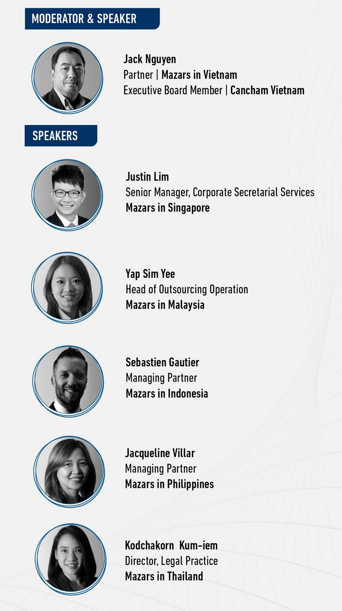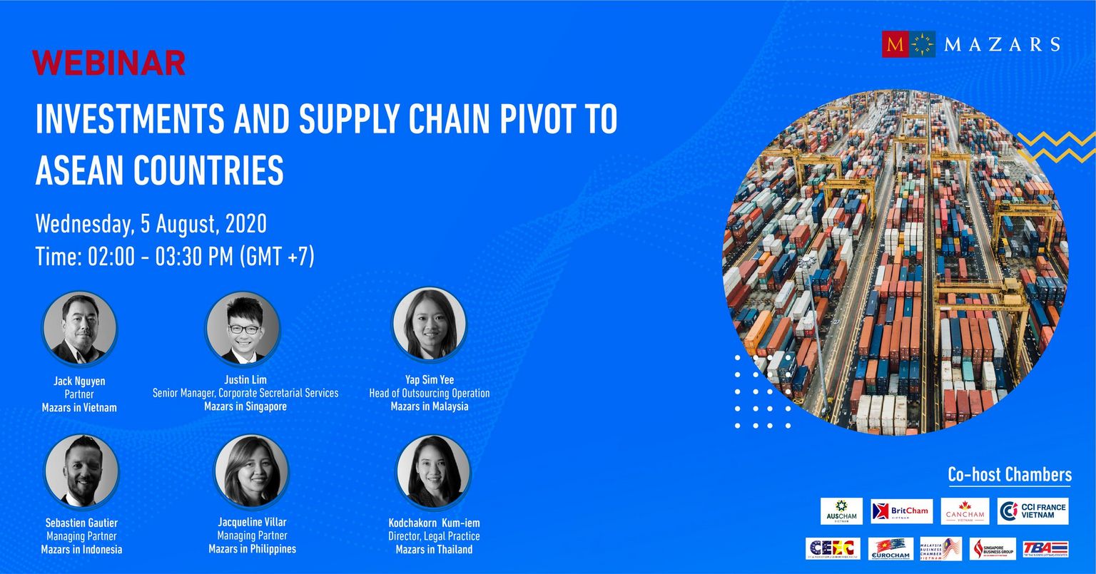 In collaboration with 9 business chambers, please join us on 5 August, 2020 at 2:00pm (Indochina Time) for Mazars' first ever regional webinar that will include Mazars leaders from Singapore, Vietnam, Thailand, Malaysia, Indonesia and the Philippines - countries that are expected to benefit from the increased investments. These experts will share their perspectives on the economic attractions, discuss the business environment and talk about the licensing and market entry procedures for investors in the country that they lead.