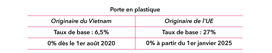 Afin de savoir quel est le calendrier de réduction pour votre produit, le Vietnam et l’UE ont, chacun, mis en place une grille tarifaire qui recense l’ensemble des produits avec le taux de base associé - c’est-à-dire celui applicable avant l’entrée en vigueur de l’EVFTA - et la catégorie de démantèlement du produit, laquelle permet de déterminer le calendrier de réduction des droits de douanes.