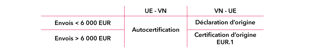 Pour les envois exportés du Vietnam vers l’Union européenne (VN → UE), la valeur de l’envoi est à prendre en considération. Le Vietnam n’ayant pas levé l’option de recourir à l’auto-certification en toute circonstance, les exportateurs vietnamiens doivent obtenir un certificat d’origine de forme “EUR.1” pour leurs envois d’une valeur supérieure à 6 000 euros. En deçà, ils peuvent certifier l’origine de leurs produits via une déclaration d’origine.
