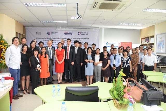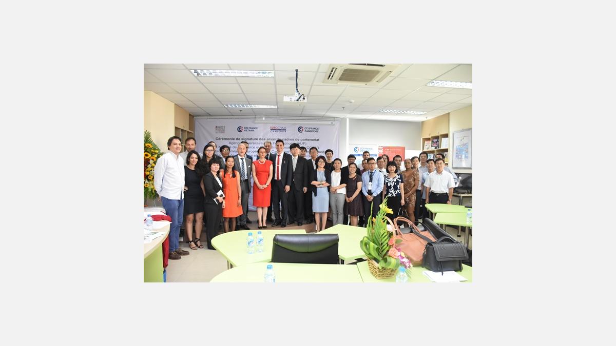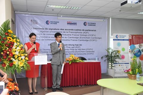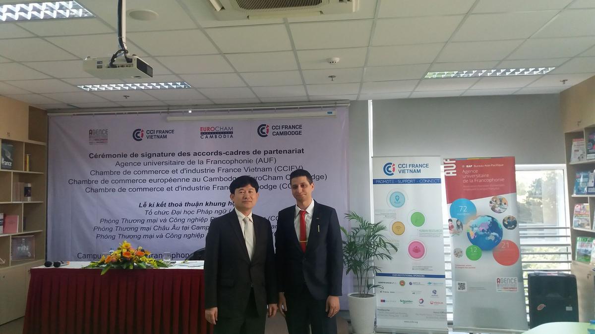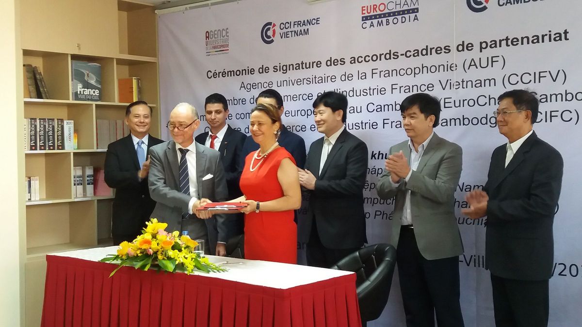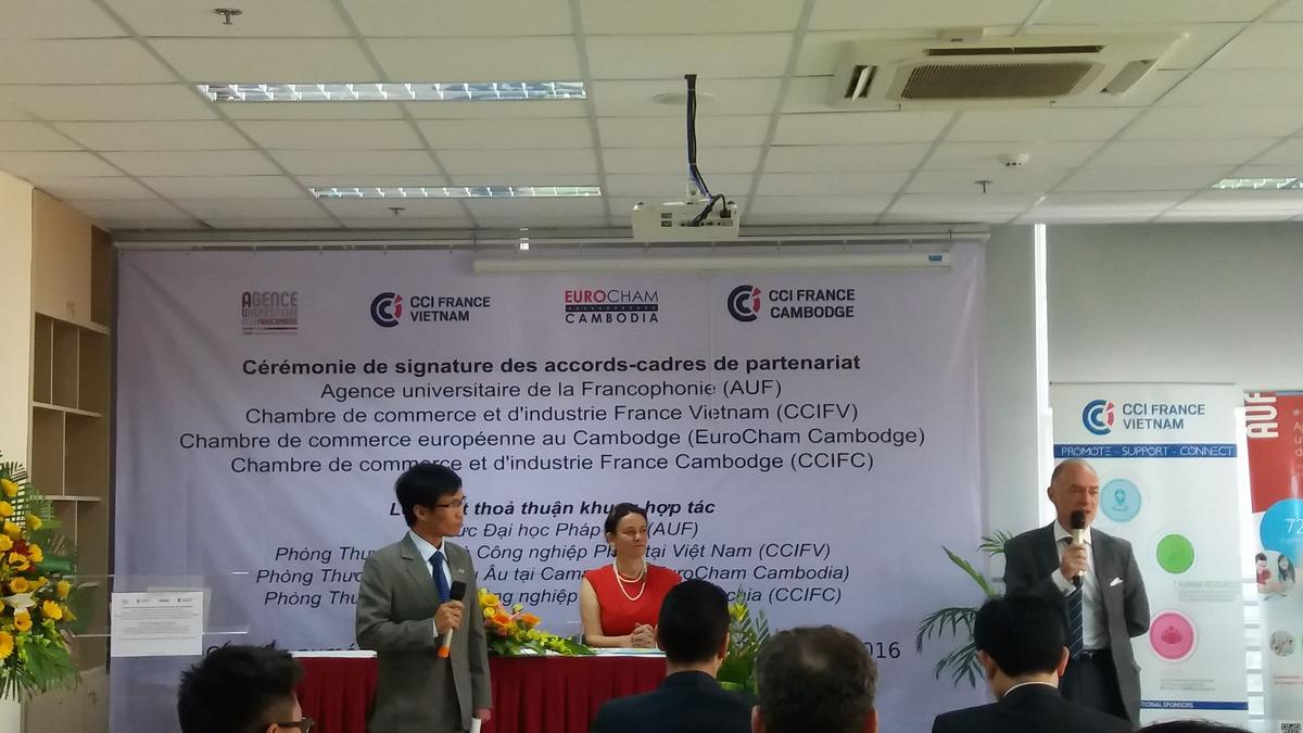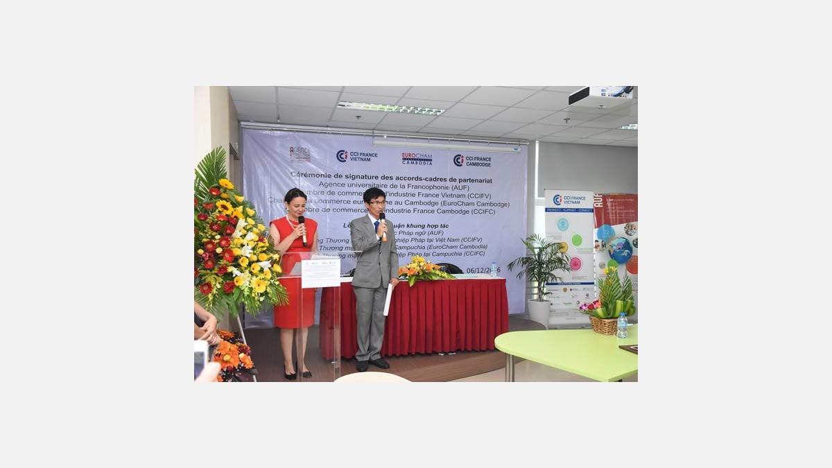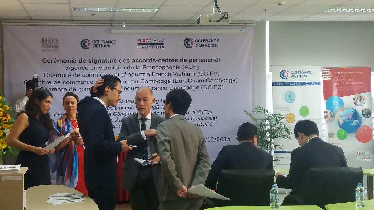 Ce mardi 6 Décembre, la CCIFV a réalisé un pas de plus vers son objectif de proximité envers la communauté vietnamienne. Nicolas Du Pasquier, Président de la CCIFV était présent à la Cérémonie de signature des accords-cadres entre l'AUF, la CCIFV, l'EuroCham Cambodge et la CCIFC, qui s’est tenue au Campus numérique francophone de Hô Chi Minh-Ville.