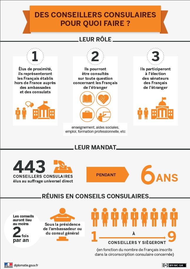 Pour rappel, les conseillers des Français de l’étranger ont la mission d’être les élus locaux et de proximité qui connaissent, soutiennent et représentent les Français de l’étranger auprès des ambassades et consulats de France à l’étranger. Ils sont élus au suffrage universel direct par les Français de leur pays / circonscription pour un mandat de 6 ans.