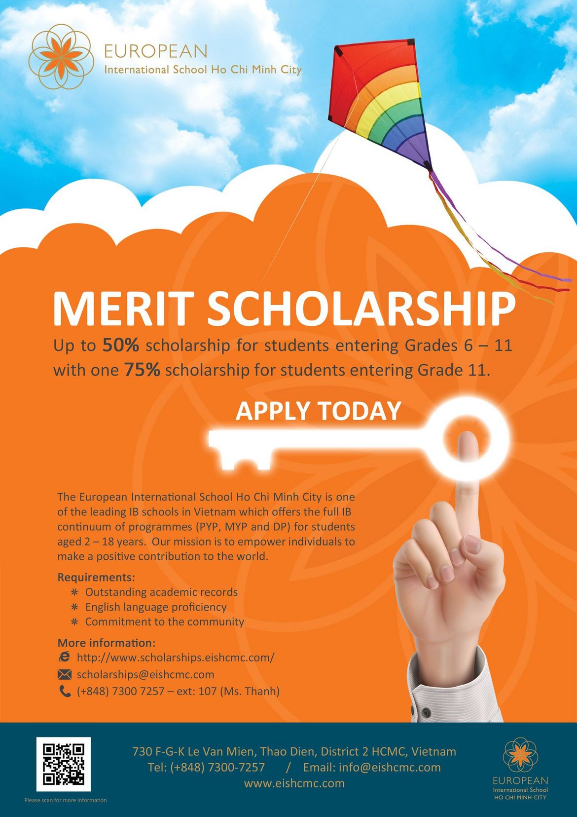 Please kindly visit website or contact Ms. Thanh via (+848) 7300 7257 – ext 107 / email: scholarships(@)eishcmc.com for more information.