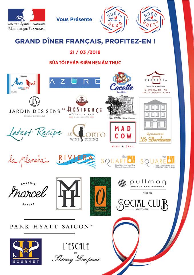 In the area covered by the French Consulate General, you can book at 17 restaurants in Ho Chi Minh City, 1 in Danang, 1 in Hoi An, 1 in Hue, 1 in Nha Trang and 1 in Vung Tau. The list is below. Enjoy !