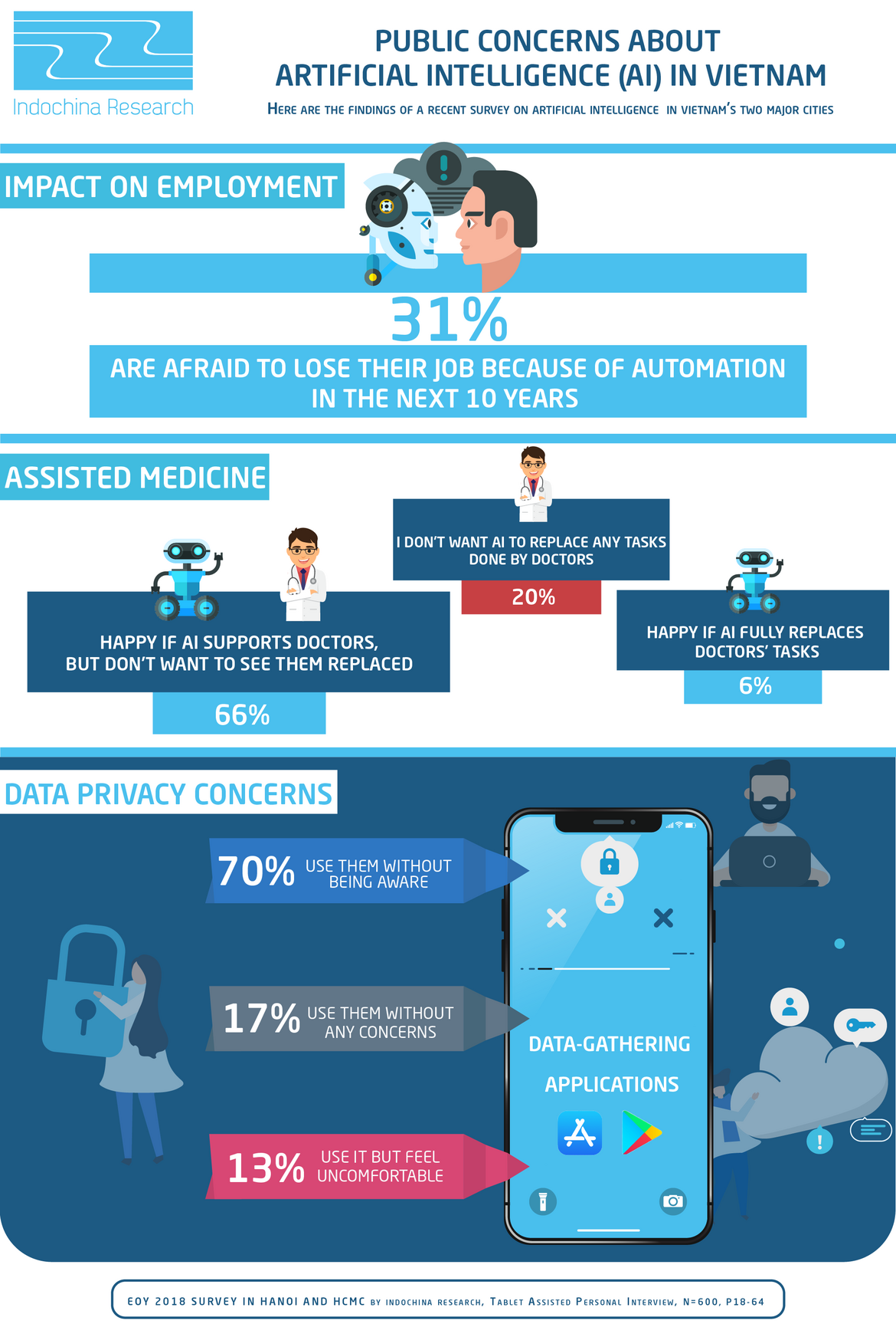 Since the Industrial Revolution, we have seen machines replacing humans in labor, production, and daily transactions. From vending machines to burger ordering interfaces, not to mention applications that collect our information, the trend continues! Here's a snapshot of Vietnamese people's opinion on Artificial Intelligence (AI) and concerns with AI replacing jobs, specially in the medical sector. We also gauged people's awareness of data gathering applications and the infograph shows what we found. The question of AI in medicine was part of a global survey including 40 countries by members of the WIN Network of research and polling agencies.