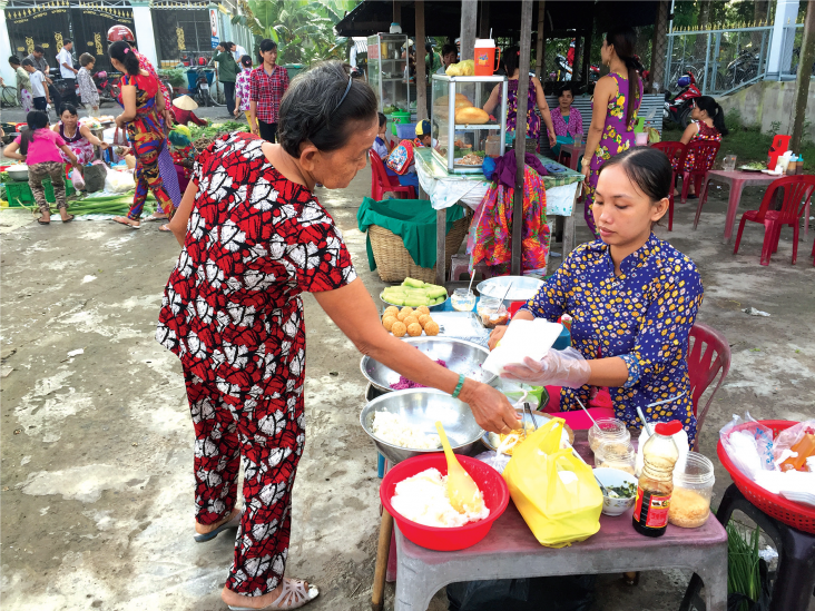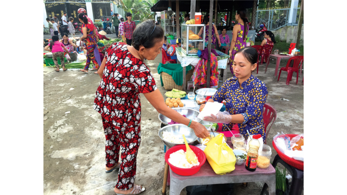 While her profits were small initially, with the support of her group members, My has built a large customer base, selling a large quantity of sticky rice every day. With a smartphone provided by the project, she also accessed business lessons and took a loan from her savings group to expand her business. She now includes stewed corn and Vietnamese pancakes for sale in the morning and different kinds of sticky rice at night.